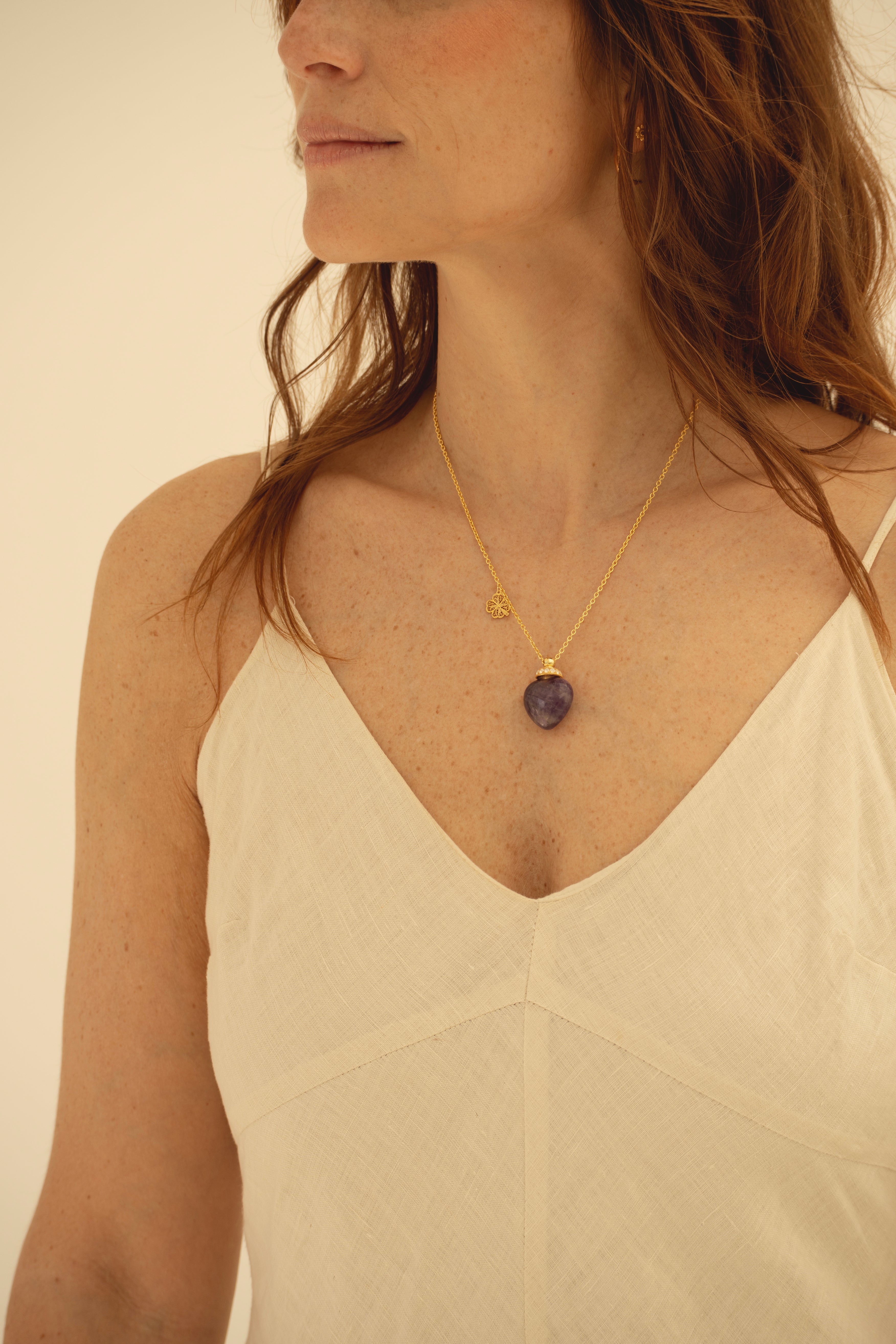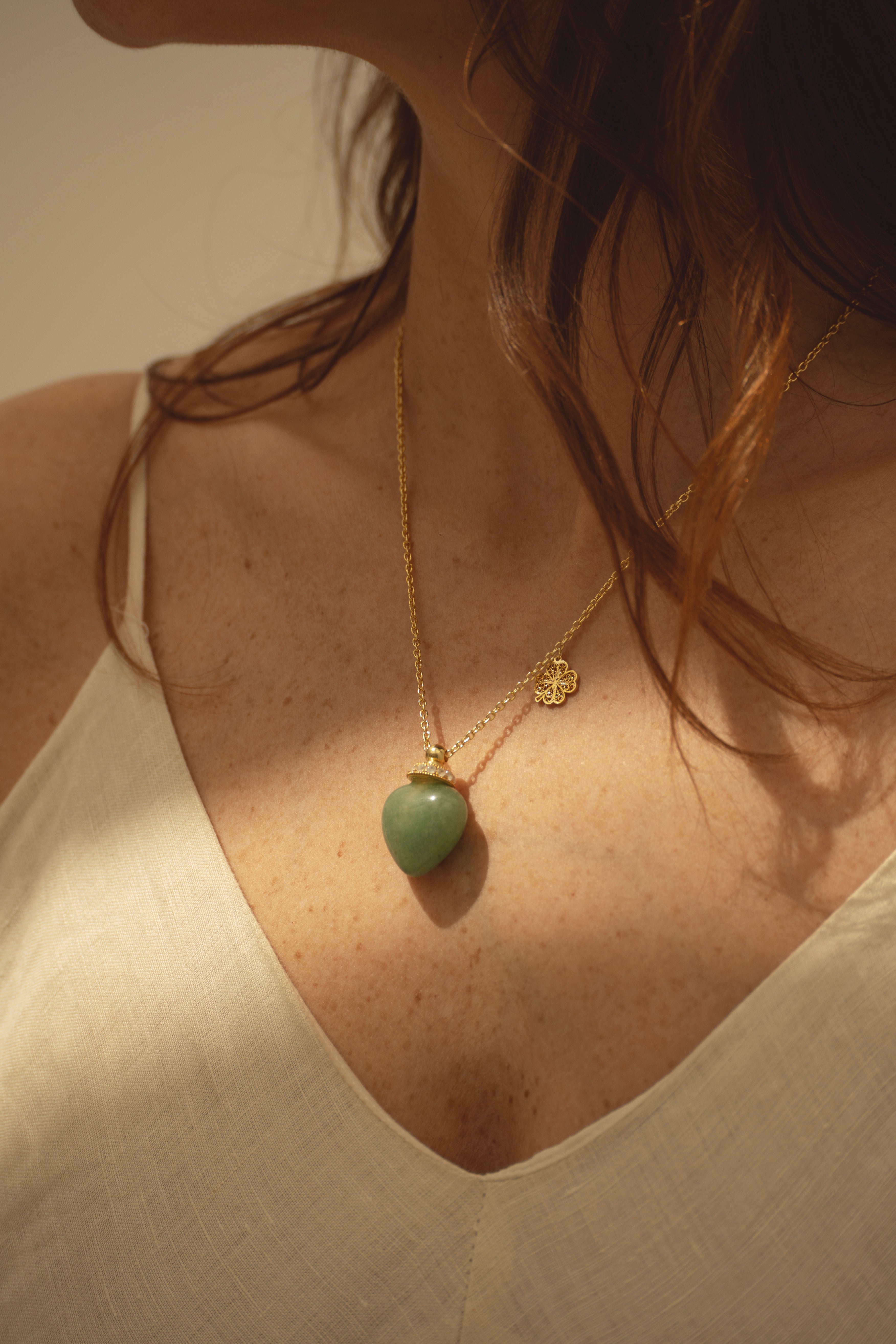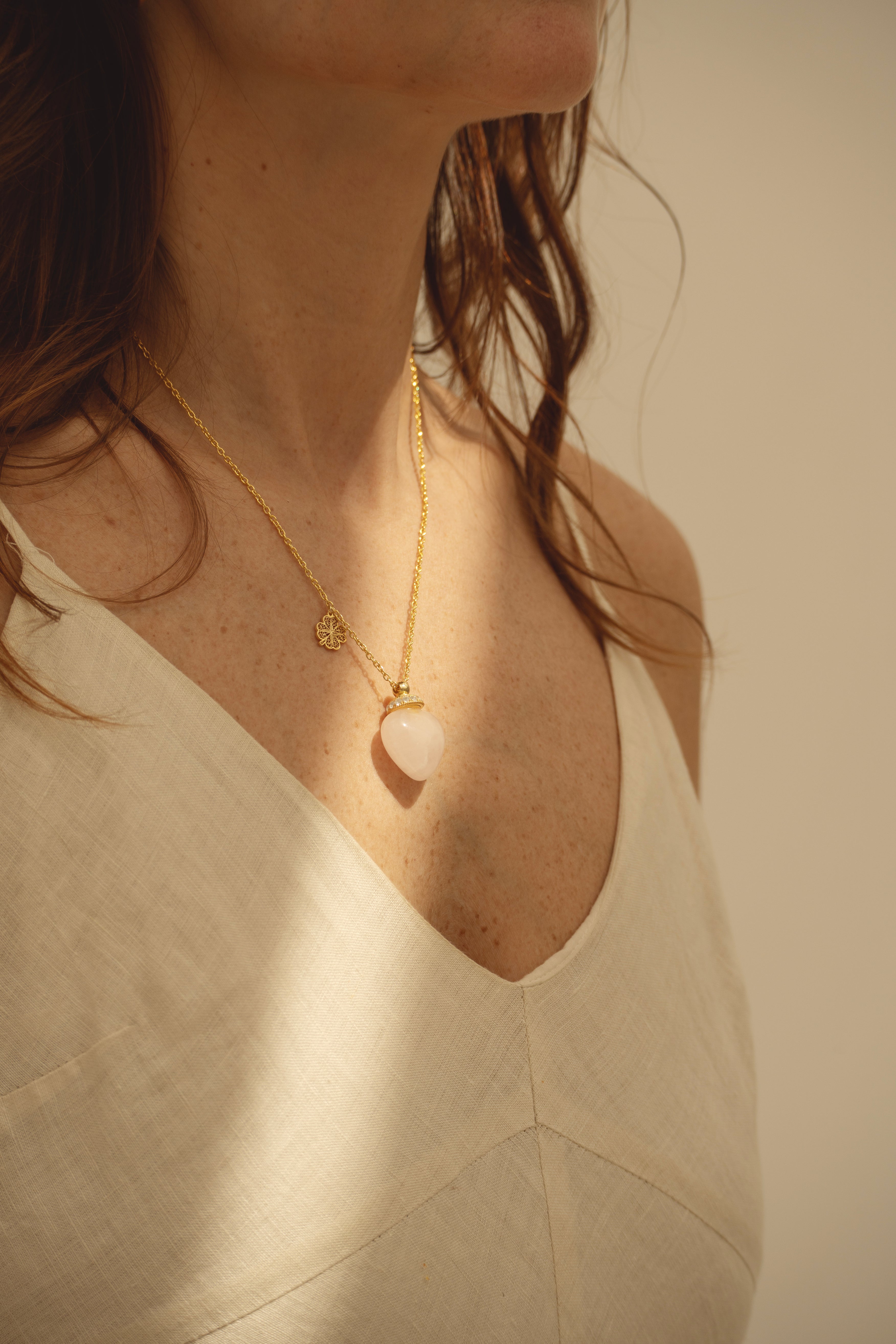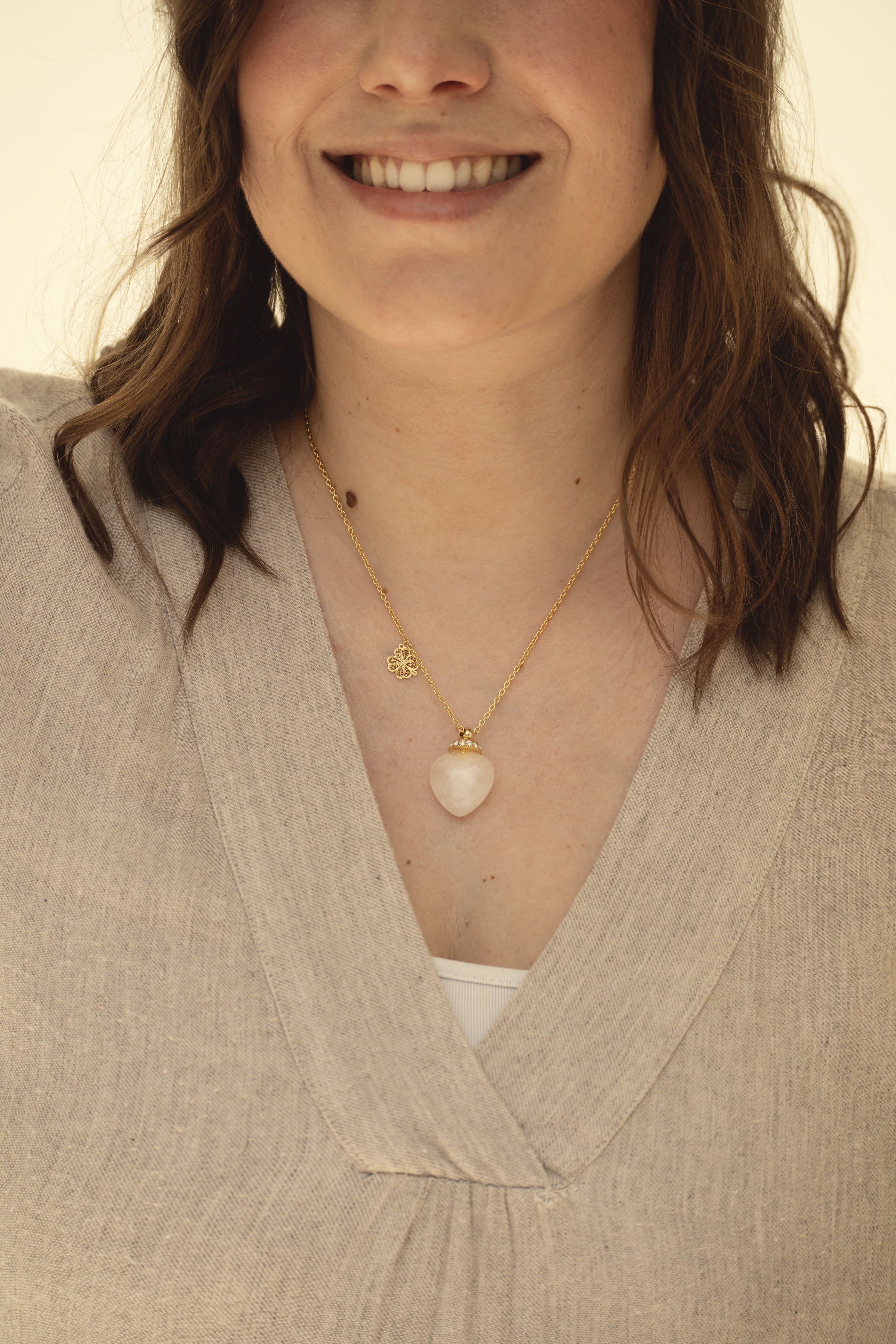 Uma peça pensada para o Dia da Mãe, com um coração em pedra natural que guarda no seu interior o aroma delicado da flor de laranjeira — símbolo de pureza, amor e novos começos.