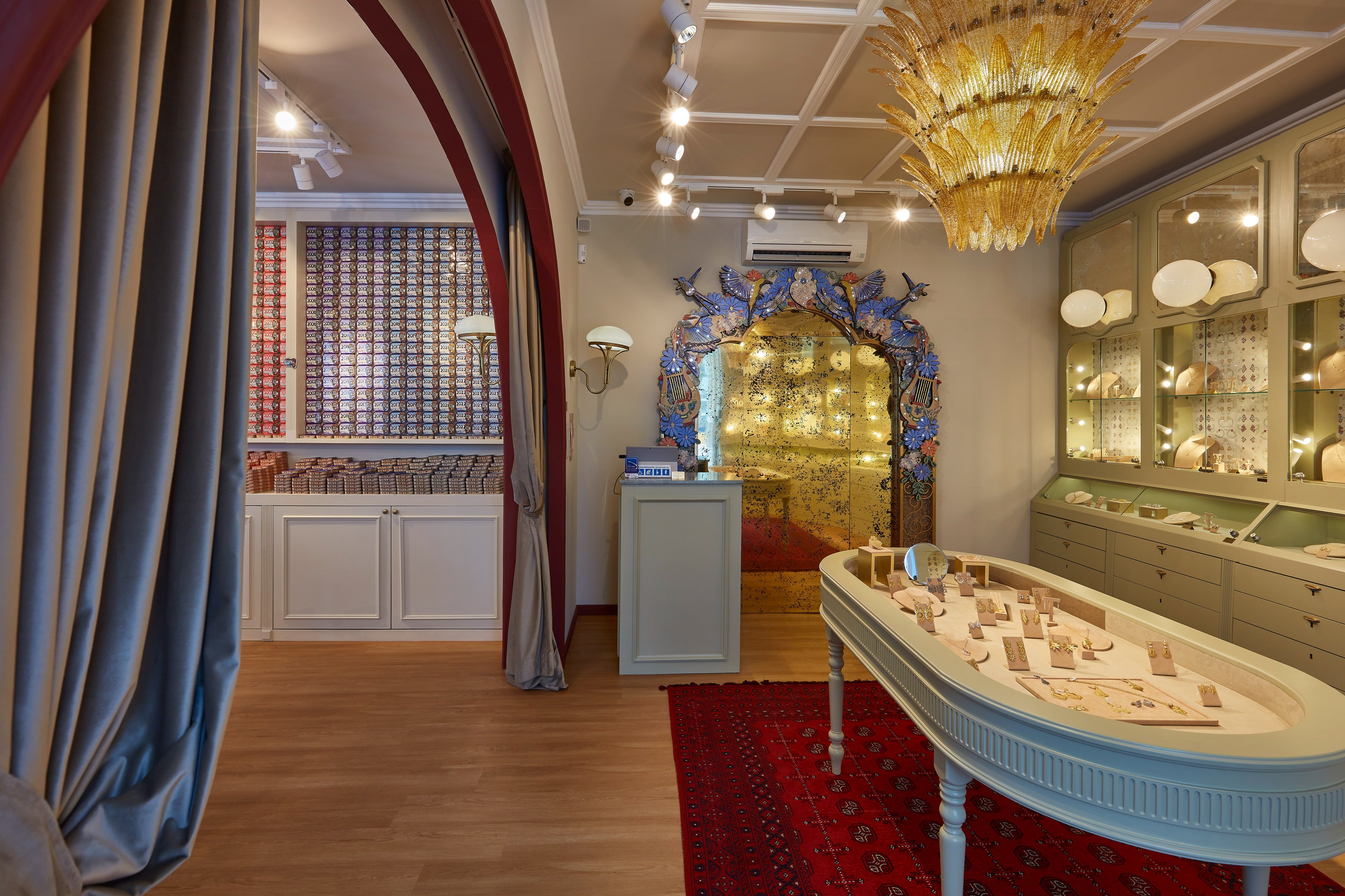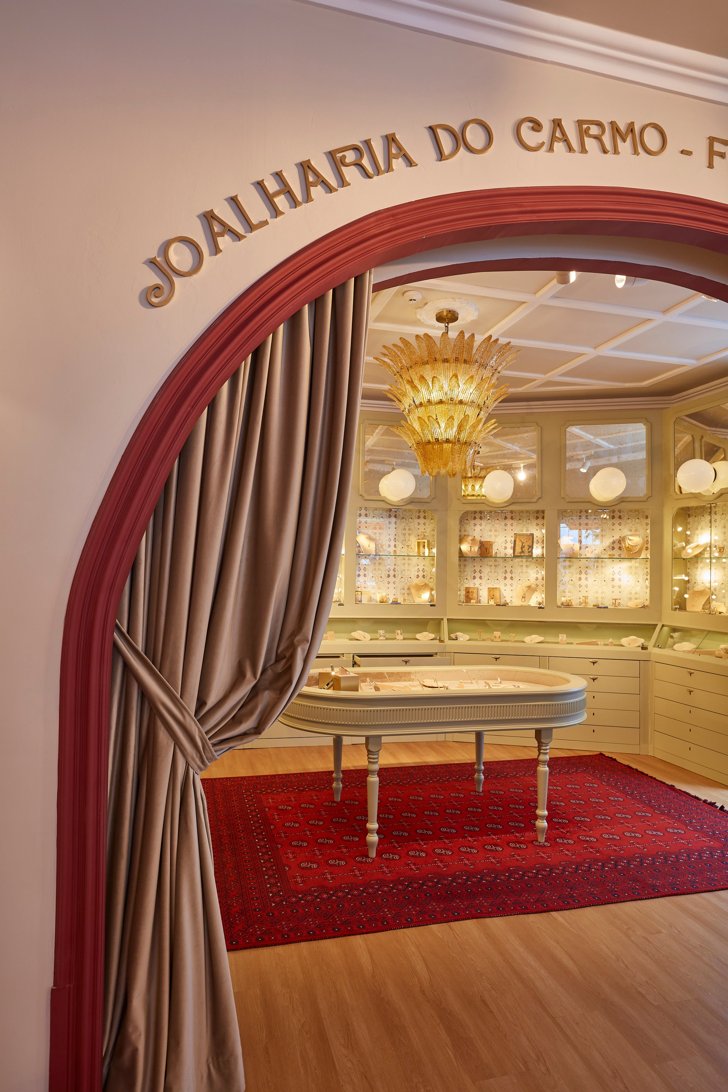 A Joalharia do Carmo partilha o espaço com as conservas da Comur, num casamento feliz e rumo ao “para sempre”. Em tons pastel, um arco de romaria e ilustrações minhotas pautam o ambiente, onde a Filigrana se apresenta como a quinta-essência da joalharia nacional.